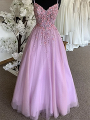 A-line V Neck Lace Applique Backless Tulle Long Prom Dresses