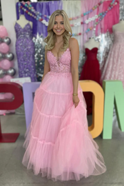 A-Line Spaghetti Straps Tulle Pink Long Prom Dress with Appliques