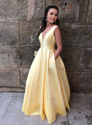 A-Line V-neck Simple Yellow Satin Long Prom Dresses With Pockets Cute Dresses