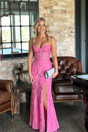 Mermaid Cute Strapless Pink Lace Appliques Long Prom Dress with Slit - US 2 / UK 6 / EU 32