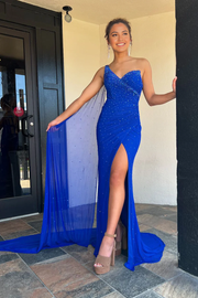 Mermaid One Shoulder Royal Blue Chiffon Long formal dresses evening gowns Prom Dresses with Beading