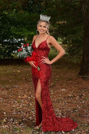 Mermaid Sparkly V Neck Dark Red Sequins Long Prom Dresses with Beading