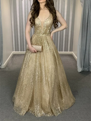 A Line V Neck Sequins Long Prom Dresses - US 2 / UK 6 / EU 32