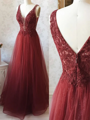 A Line V Neck Tulle Lace Long Prom Dresses Long Formal Evening Dresses