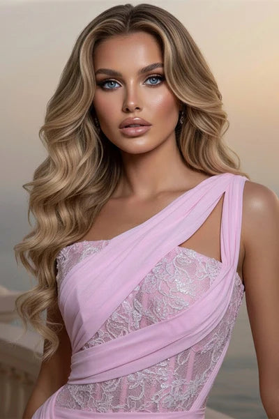 This soft pink gown features a one-shoulder design with cutout detail, delicate lace trim at the bodice, and a flowing A-line maxi silhouette with a subtle train. The lightweight fabric and romantic details exude feminine elegance, making it ideal for beachside weddings, sunset galas, or spring formal events.