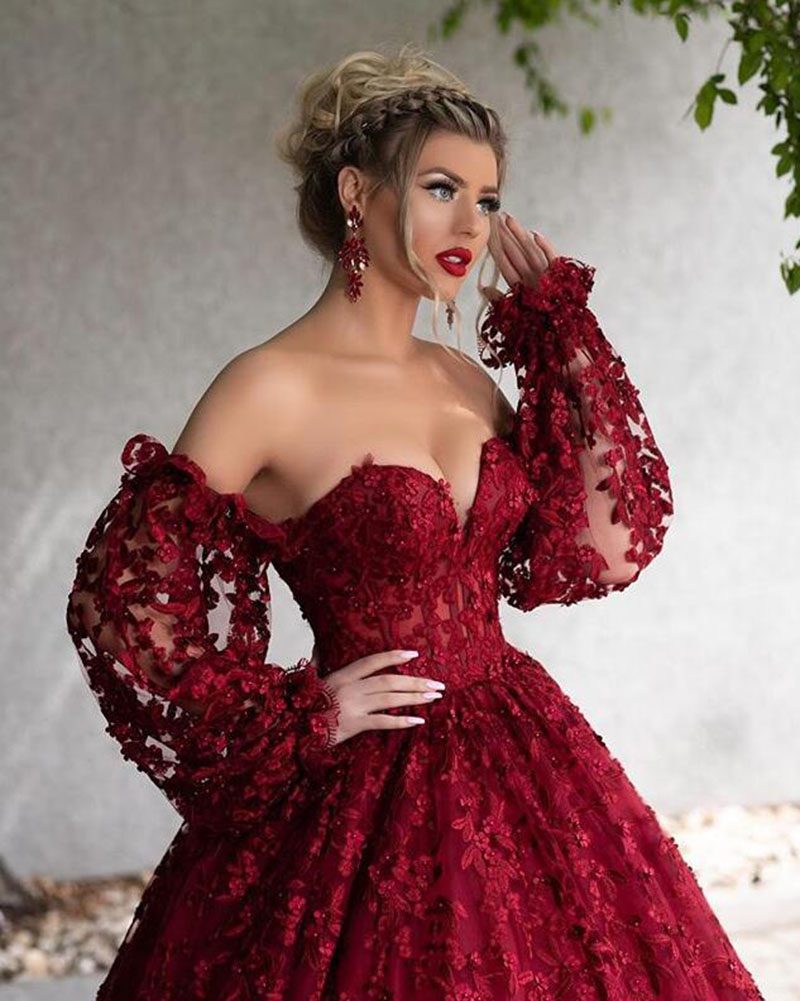 This burgundy gown features an off-shoulder sweetheart neckline, intricate all-over lace detailing, dramatic puff sleeves, and a voluminous ball gown skirt. The rich lace texture and bold silhouette exude royal elegance, making it ideal for proms, formal weddings, or grand evening galas.