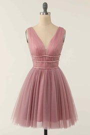 A-line V Neck Sleeveless Beaded Homecoming Dress
