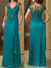 A-Line Lace Floor-Length Mother Of The Bride/ Groom Dress  Turquoise Appliques Chiffon Short Sleeve Ruffles Belt