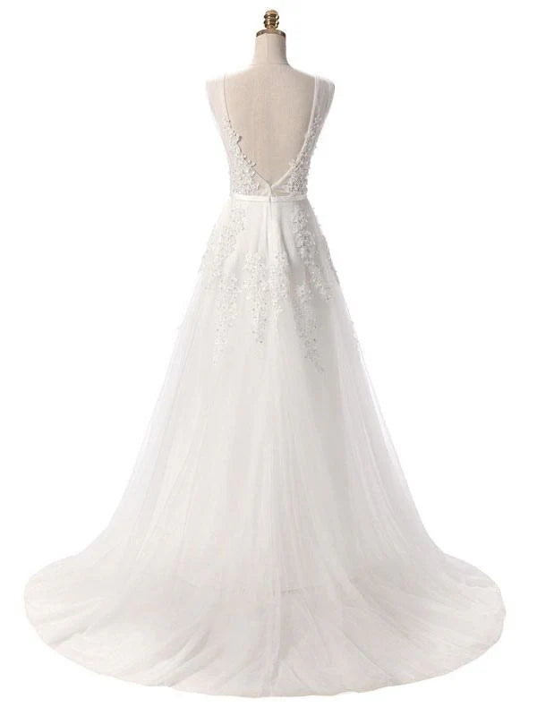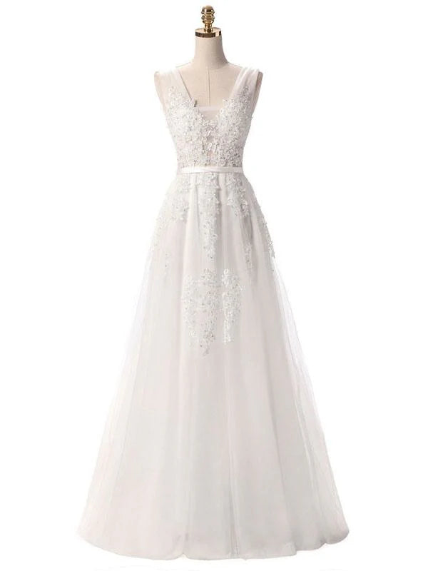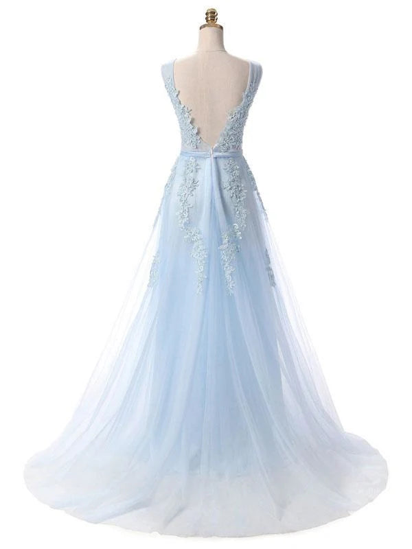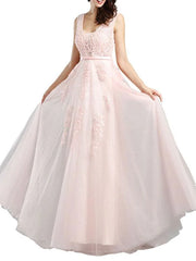 A Line V Neck Sleeveless Floor Length Lace Applique Prom Dress