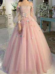 Artistic Ball Gown Off-the-Shoulder Long Sleeves Floor-Length Tulle Prom Dresses