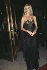 Black Mermaid Strapless Lace Tiered Long Prom Dress, Party Dress