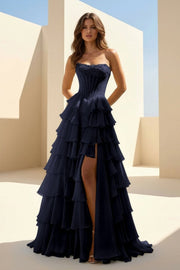 This gown features a strapless bodice with delicate lace detailing, a structured corset waist, and a voluminous tiered ruffled skirt with a high slit. The lightweight fabric and dramatic silhouette balance sophistication with airy movement, making it ideal for formal banquets, outdoor galas, or upscale evening events.
