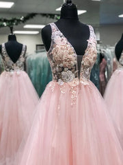 Deep V Neck V Back Lace Floral Long Prom Dresses