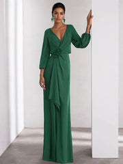 Elegant A-Line Evening Gown Elegant Dress Formal Wedding Guest Floor Length Long Sleeve V Neck Stretch Crepe with Ruffles