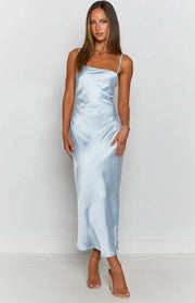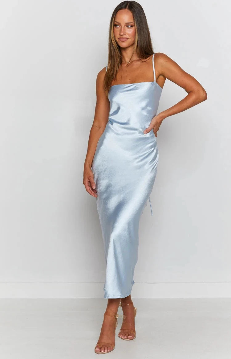 This airy sky blue prom dress features a sleek sheath silhouette crafted from luxe satin. The square neck and thin spaghetti straps exude understated charm, while the lace-up back adds a customizable, alluring detail. The floor-length skirt balances elegance and simplicity—perfect for prom, cocktail parties, or evening events.