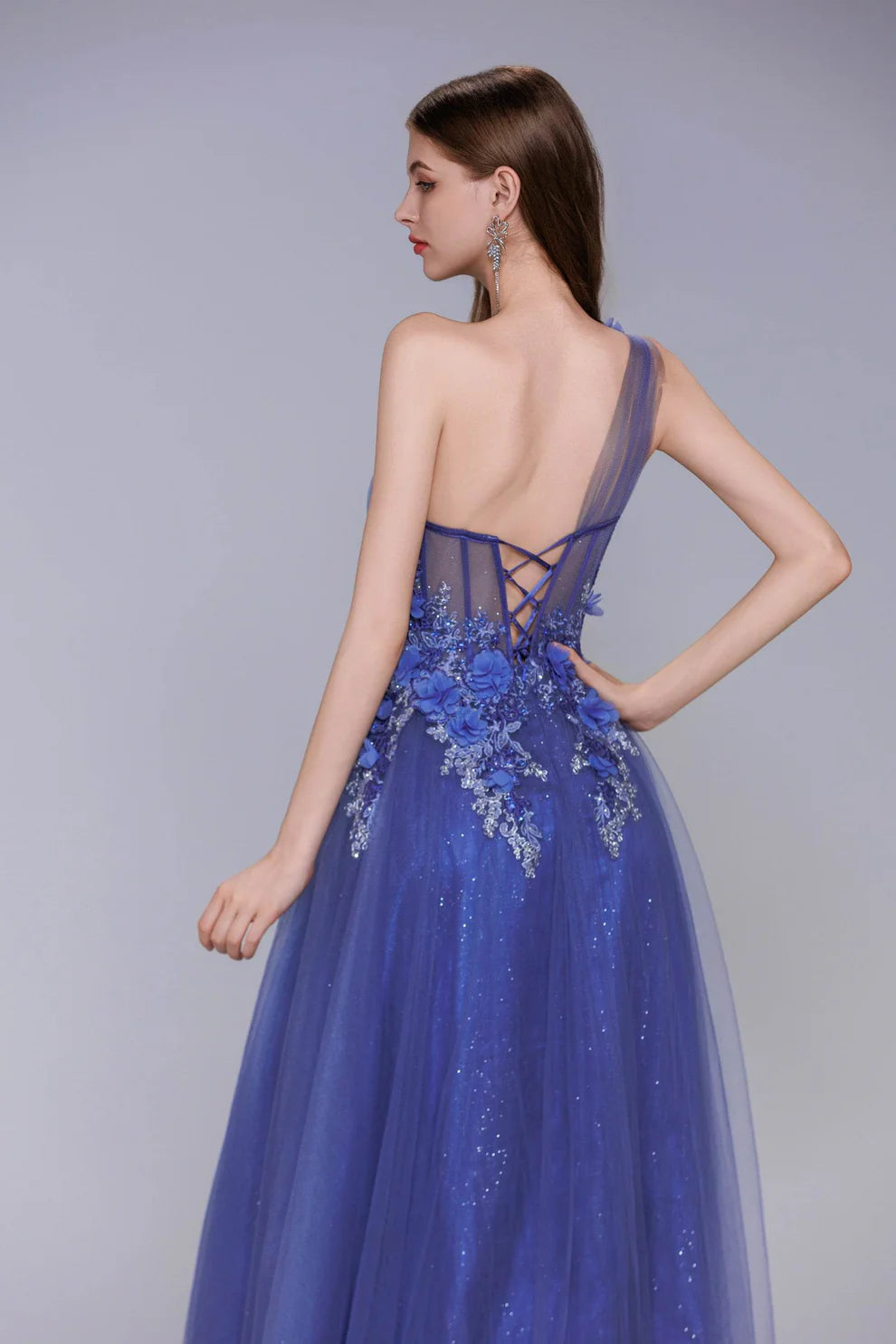 This enchanting prom dress features a sleek one-shoulder neckline and a sleeveless cut that highlights your collarbones and arms. The fitted bodice is adorned with 3D floral appliqués and sparkling silver embroidery, while the glittering tulle A-line skirt flows into a dramatic floor-length hem with a thigh-high slit for a touch of allure. The lace-up back design ensures a customized fit, making it perfect for prom, evening galas, or any formal occasion where you want to shine.
