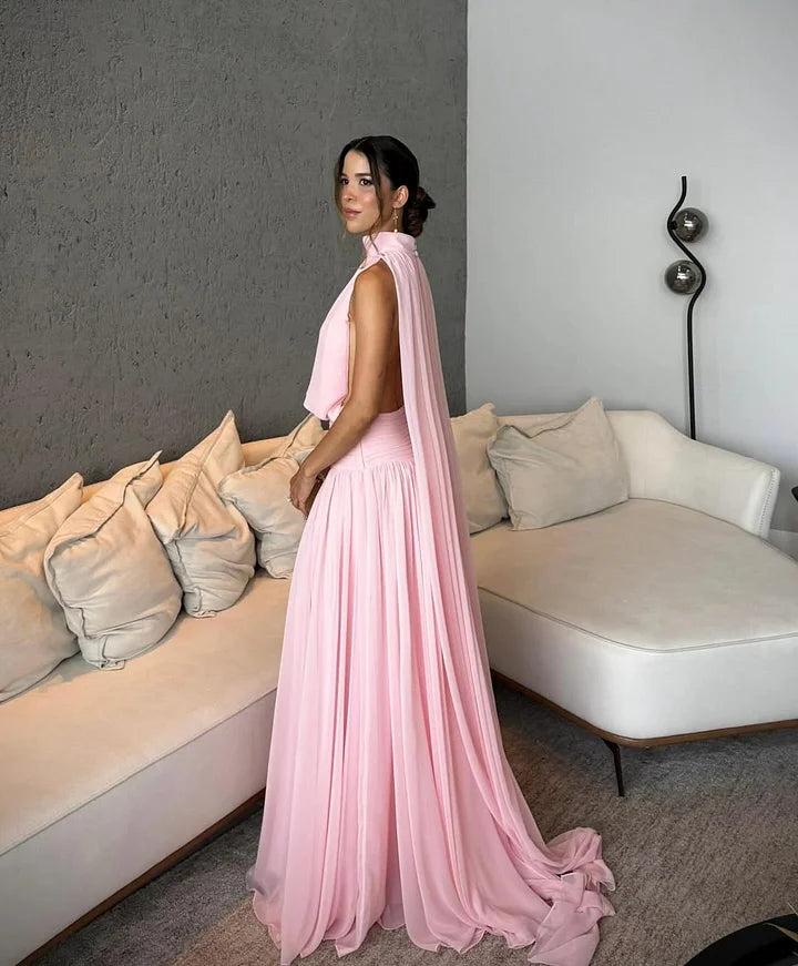 BL's elegant and romantic formal gown is made from lightweight, flowy soft chiffon in a gentle blush pink tone, bringing a dreamy and ethereal wearing experience. It features a sophisticated halter neck design that modifies the neckline gracefully, with a sleek open back to add a touch of delicate allure. The tailored ruched waist detail perfectly cinches the waist to create a slim, flattering silhouette, while the full pleated maxi skirt drapes smoothly and extends into a soft sweep train, releasing graceful movement with every step. Minimalist yet luxurious, this dress is perfectly suited for bridesmaid events, wedding ceremonies, engagement parties, formal evening banquets, cocktail parties and all upscale romantic special occasions.