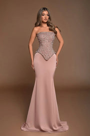 Gorgeous Dusty Rose Strapless Beaded Embellished Peplum Bodice Satin Mermaid Train Evening Dress Prom Dress