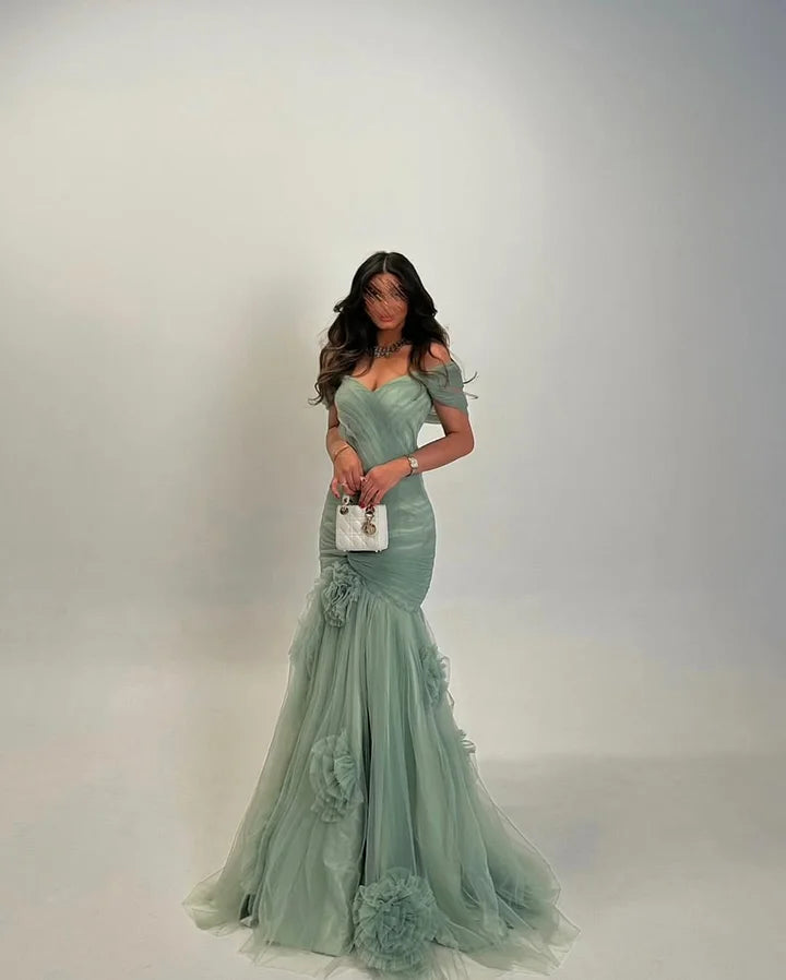 BL's dreamy and romantic formal gown is crafted from lightweight, flowy tulle in a soft sage green hue, delivering an ethereal, fairy-tale like aesthetic. It features a classic sweetheart neckline with delicate short sleeves that frame the shoulders gracefully, while the ruched waist detail cinches the figure to create a flattering, feminine silhouette. The mermaid skirt is adorned with exquisite 3D floral appliqués that cascade down the fabric, adding texture and dimension, and flares gently at the hem for a dramatic, flowing drape. Perfect for wedding ceremonies, engagement photoshoots, prom nights, and all romantic formal occasions where you want to exude whimsical elegance.