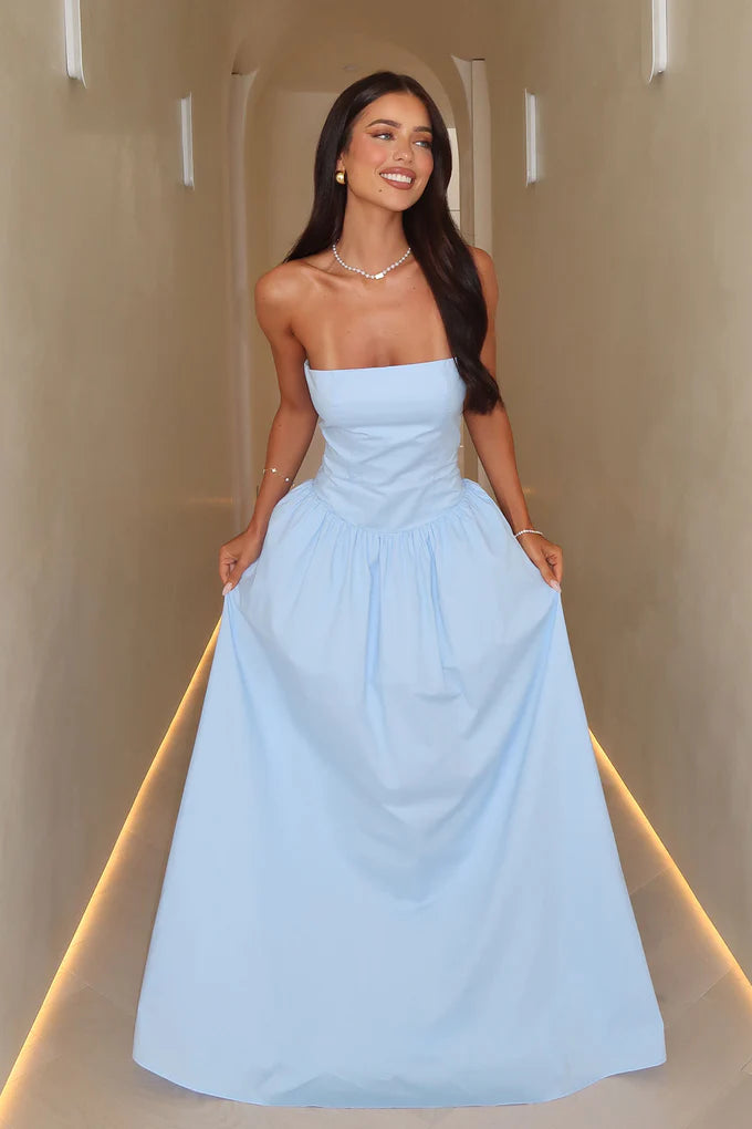 BL's elegant, modern gown is crafted from a structured cotton blend in a fresh sky blue hue, featuring a sleek strapless neckline and a tailored corset bodice that cinches your waist. The voluminous A-line skirt flows softly and includes convenient side pockets, combining timeless sophistication with practicality. Perfect for wedding guests, cocktail parties, or any special occasion where you want to exude confident, feminine elegance.