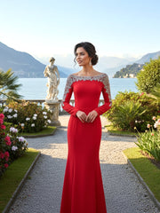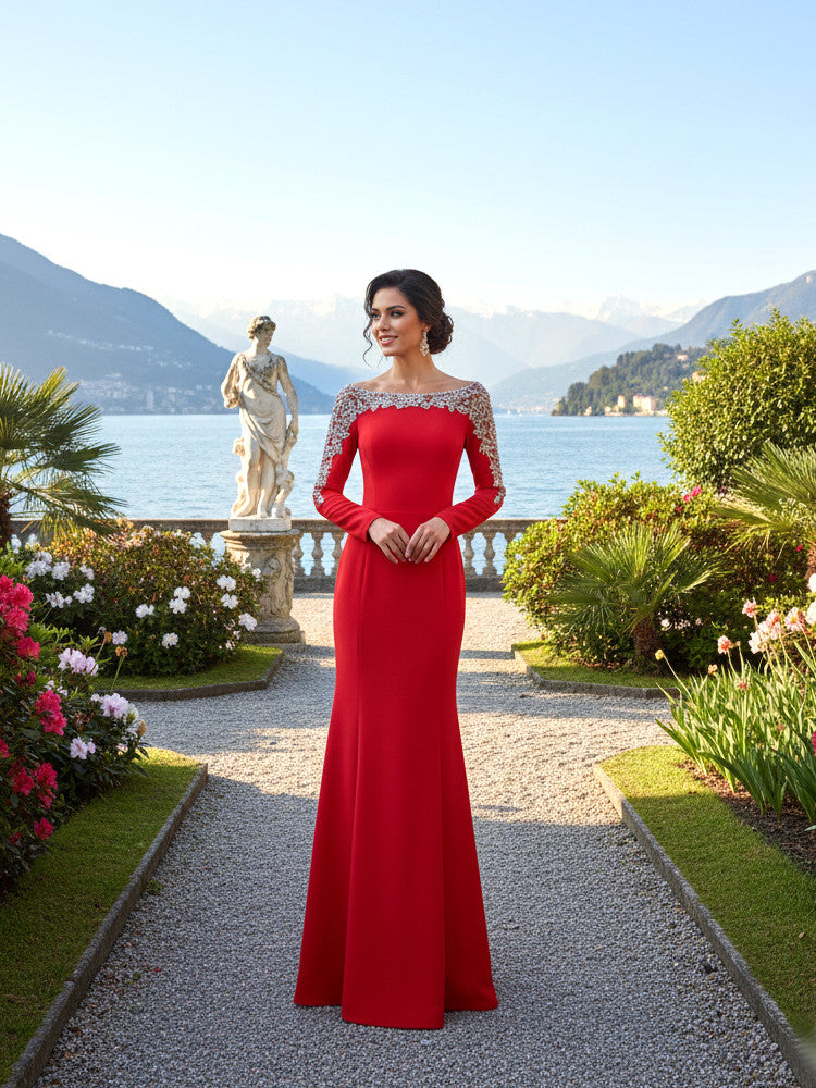Long Sleeve Crystal Shoulders Prom Dresses Red