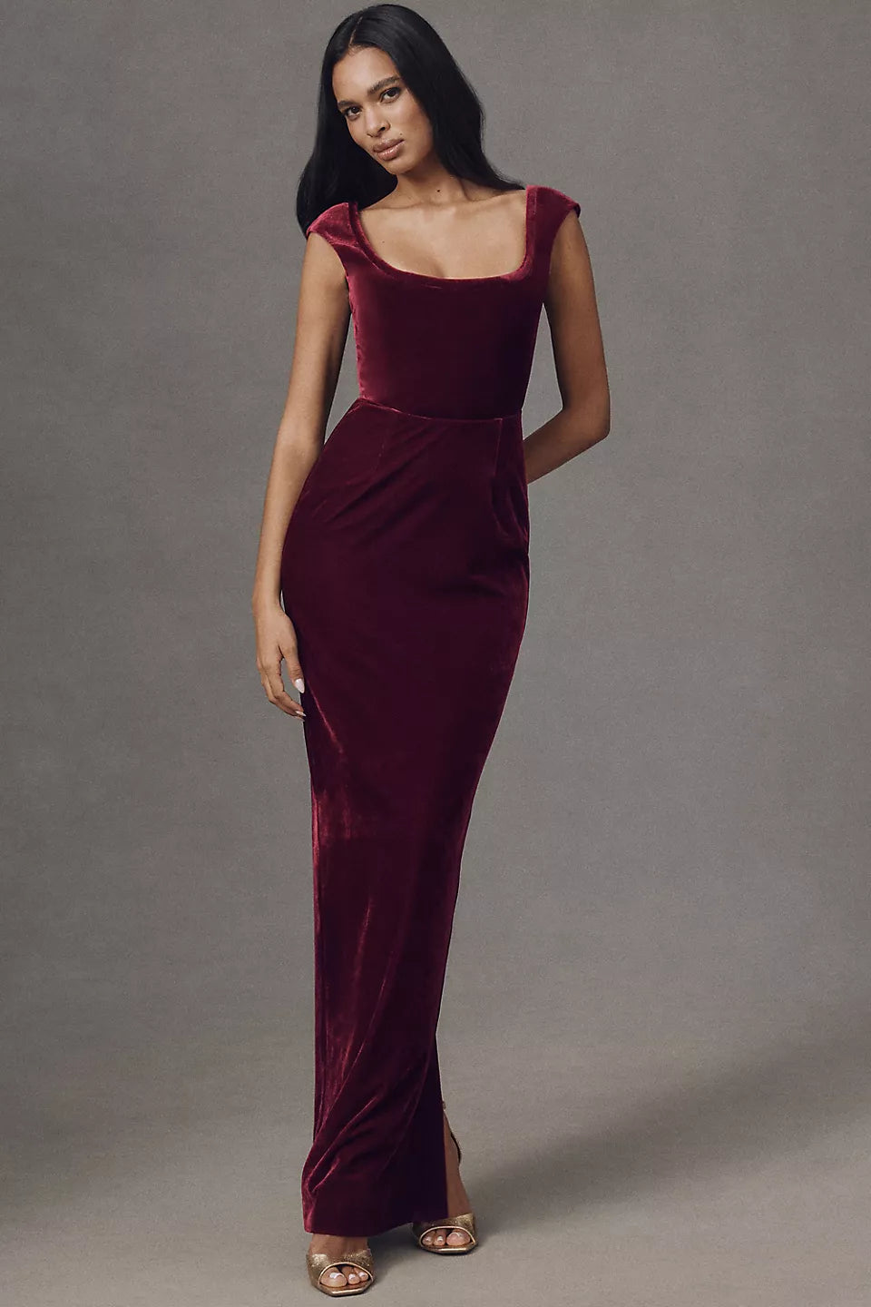 This opulent velvet evening dress in rich burgundy exudes timeless elegance. The sleek sheath silhouette hugs your figure for a sophisticated, tailored fit, while the square neckline and delicate cap sleeves frame your shoulders and collarbones. The dramatic low-back design adds an alluring touch, and the floor-length hem features a subtle back slit for ease of movement. Crafted from plush, lustrous velvet, this gown is perfect for winter weddings, holiday galas, or any formal occasion where you want to make a refined statement.