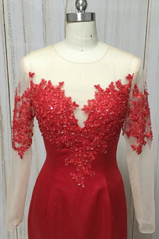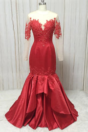 Mermaid Long Sleeve Satin Round Neck Long Lace Prom Dress