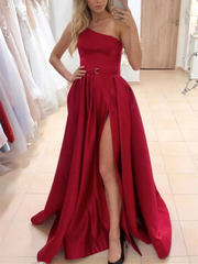 A-line One Shulder Satin Long Prom Dresses With Slit