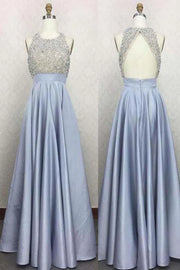 A-Line Top Beaded Open Back High Neck Floor Length Prom Dresses