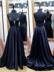 A-line V Neck Backless Satin Long Prom Dresses