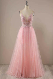 A-line V Neckline Sparkly Tulle Applique Long Prom Dress