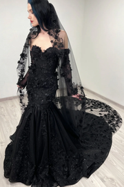 Chic Black Mermaid Sweetheart Lace Off-The-Shoulder Long Sleeves Sequined Cathedral Train Satin Evening Dresses With Appliques