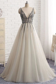 Deep V neck Bling Sleeveless Tulle Sequins Formal Dresses Prom Dress