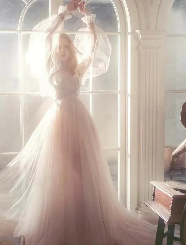 Elegant A-Line Boho Engagement Formal Evening Birthday Dress Scoop Neck Long Sleeve Sweep / Brush Train Tulle with Pleats Ruched