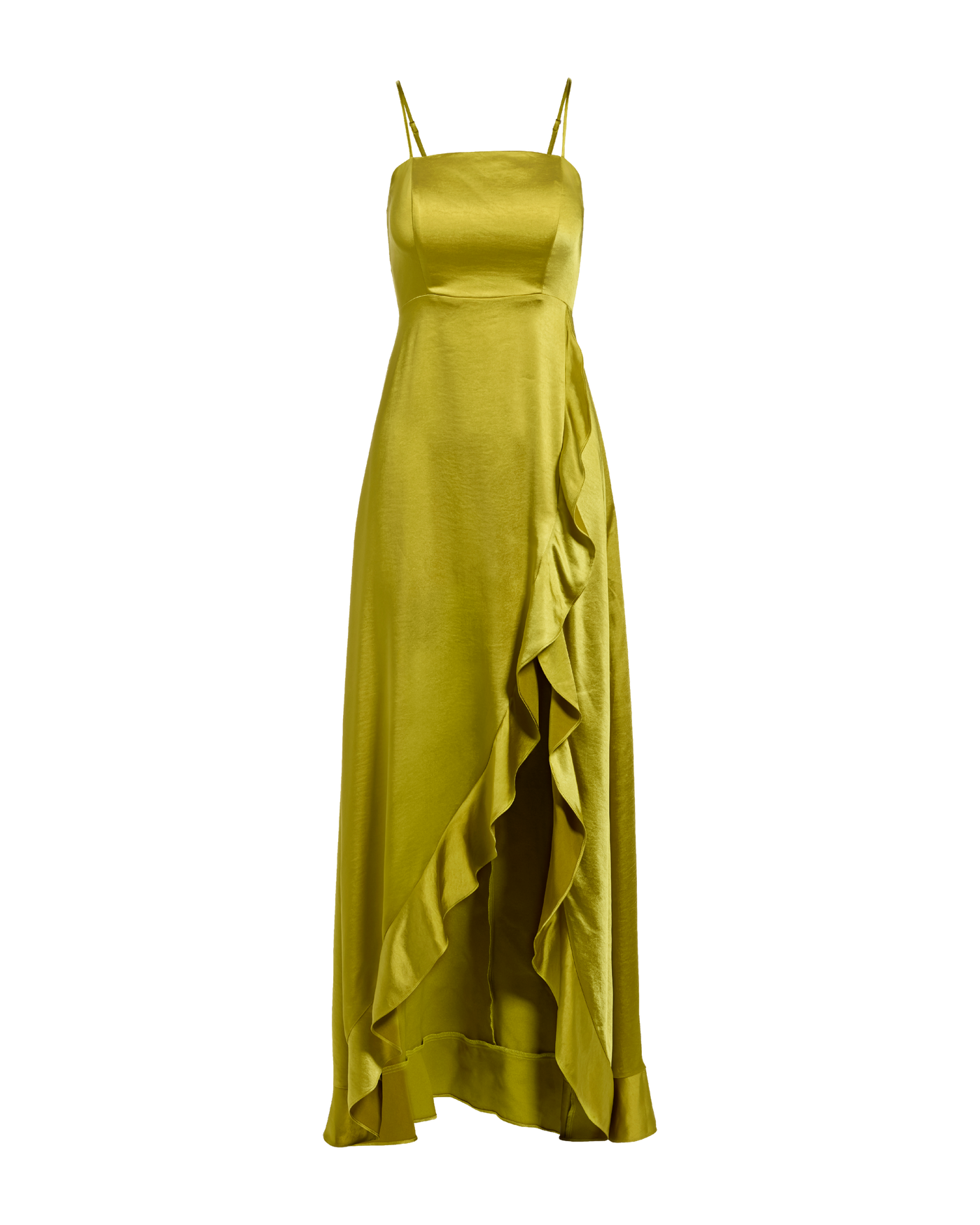 Luxe Spaghetti Straps Split Satin Ruffle Gown Prom Dresses