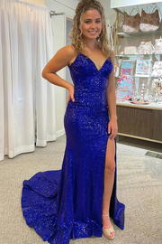 Mermaid Charming Royal Blue Sequins Long Prom Dresses with Slit