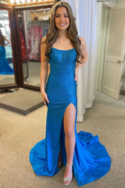 Mermaid Cute Scoop Neck Royal Blue Satin Long Prom Dress with Slit