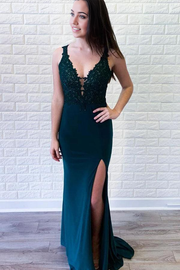Mermaid Deep V-neck Appliques Green Satin Prom Dresses Formal Dress