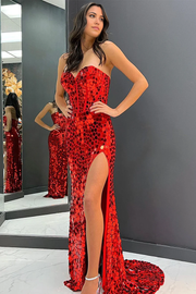 Mermaid Gorgeous Sweetheart Red Sequins Long Prom Dresses with Side Slit
