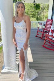 Mermaid Sequins Backless Slit Prom Dresses Long Formal Dress