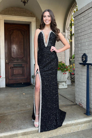Mermaid V Neck Black Sequins Long Prom Dress with Beading