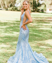 Mermaid V Neck Charming Blue Sequins Long Prom Dress - US 2 / UK 6 / EU 32