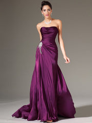 Purple Strapless Sleeveless Ruched Bodice Crystal Sheath Prom Dresses