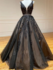 V Neck Lace Beads Tulle Long Prom Dresses