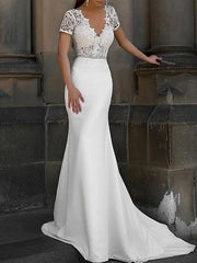 Simple Wedding Dress Mermaid Lace V Neck Short Sleeves Beaded Sash Bridal Dresses With Train - US 2 / UK 6 / EU 32