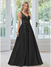 A-Linien-Abendkleid, schwarzes Kleid, formell, bodenlang, ärmellos, V-Ausschnitt, Spitze mit Applikationen