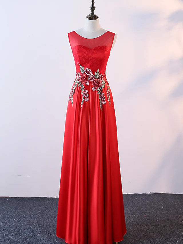 A-Linie Abendkleid Elegantes Kleid Ballkleid Bodenlang Ärmellos Rundhals Satin mit Stickerei-Applikationen