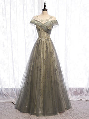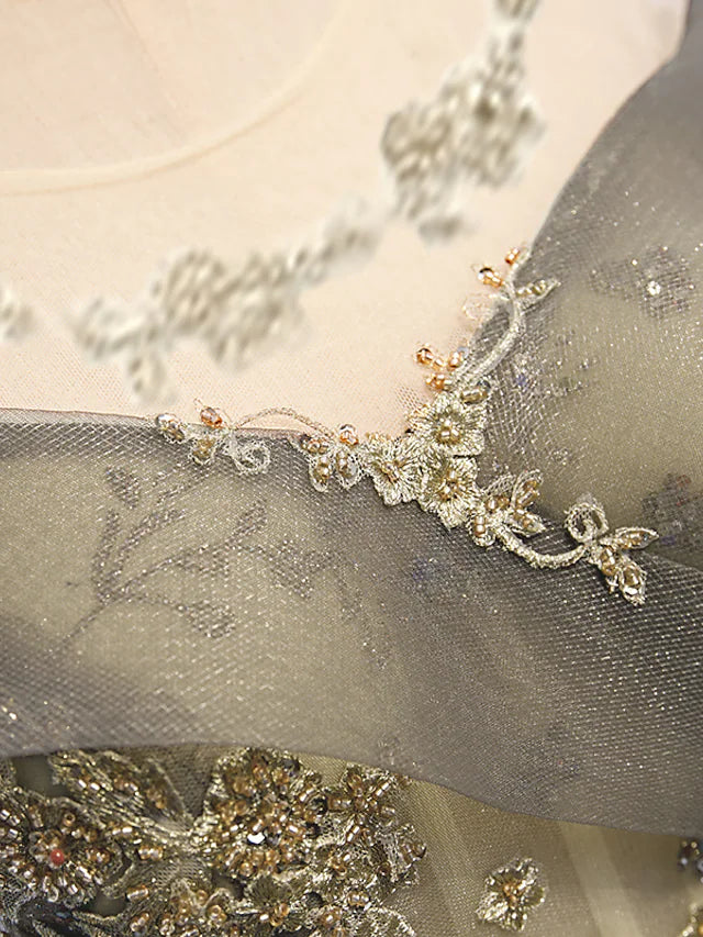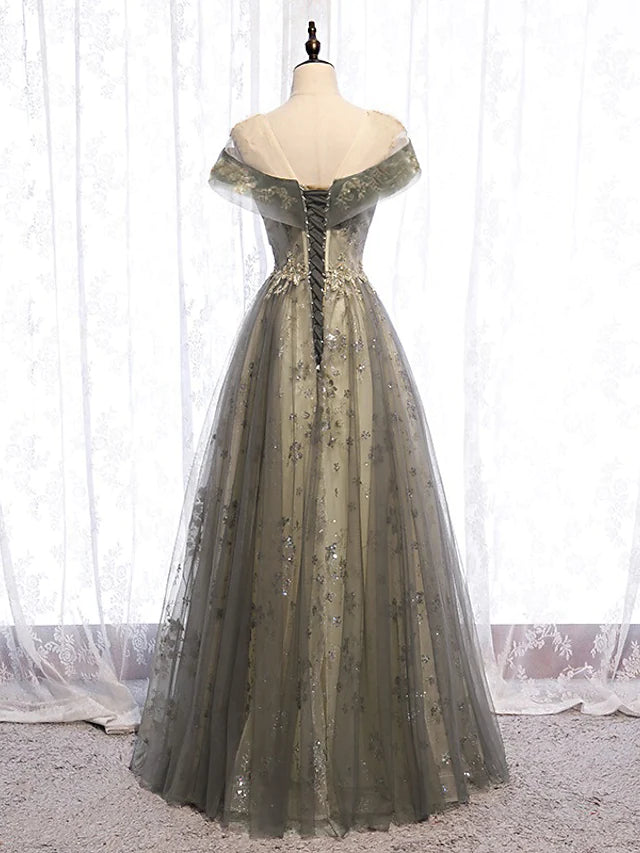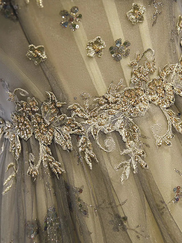A-Linie Abendkleid Elegantes Kleid Hochzeitsgast Bodenlang Kurzarm Illusionsausschnitt Tüll mit Falten