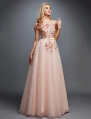 A-Linie Blumenkleid für Hochzeitsgäste, Sweep/Pinselzug, ärmellos, schulterfrei, Tüll über Spitze mit Applikationen
