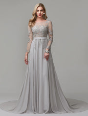A-Linie, luxuriöses Verlobungs- und Abendkleid, Illusionsausschnitt, V-Ausschnitt am Rücken, tiefer Rückenausschnitt, lange Ärmel, Kapellenschleppe, Chiffon mit Paillettenapplikationen - US 2 / UK 6 / EU 32 / Silber